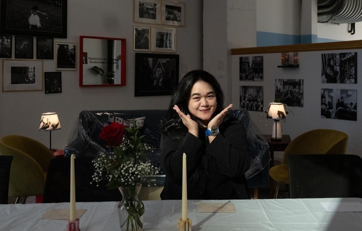 Tucked inside my brown linen envelope was a Himalayan paper card bearing my name, its surface designed with a chowrie—a peacock-feather fan in a bejeweled ritual vessel used by Hindus, Buddhists, and Sikhs to honor royalty, deities, and spiritual leaders—and a gem-encrusted shehnai, an instrument typically played in spiritual ceremonies, processions, and weddings. These symbols were a bridge between faith, art, and arrival, mirroring Xyza’s photograph The Body Is a Vessel, where Chef Tab Hu stands with his back to the camera to reveal his tattoos as his family surrounds him, reminding us—as Xyza says— that “our bodies are living archives, carrying our memories, scars, laughter lines, and everything in between.”