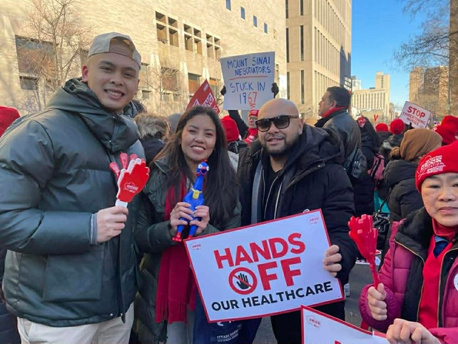 Daya said the mood in the picket line remains strong and upbeat. Filipino nurses are visible as they take on leadership roles: “They are the ones organizing the marchers, they are the speakers, they are the strike captains, they are holding the lines.” She estimates the protest crowd at more than a thousand.