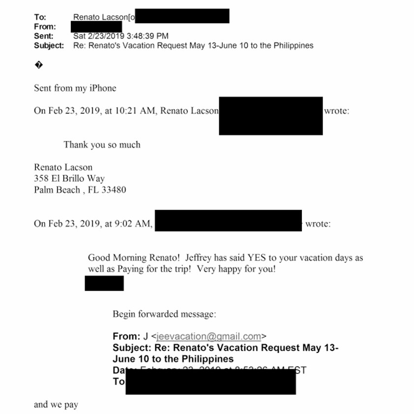 In a February 23, 2019 email to Renato Lacson, the sender whose name was redacted wrote: “Good morning Renato! Jeffrey has said YES to your vacation days (May 13 to June 10) as well as paying for the trip. Very happy for you.” Lacson had requested emergency leave to visit his ailing father.