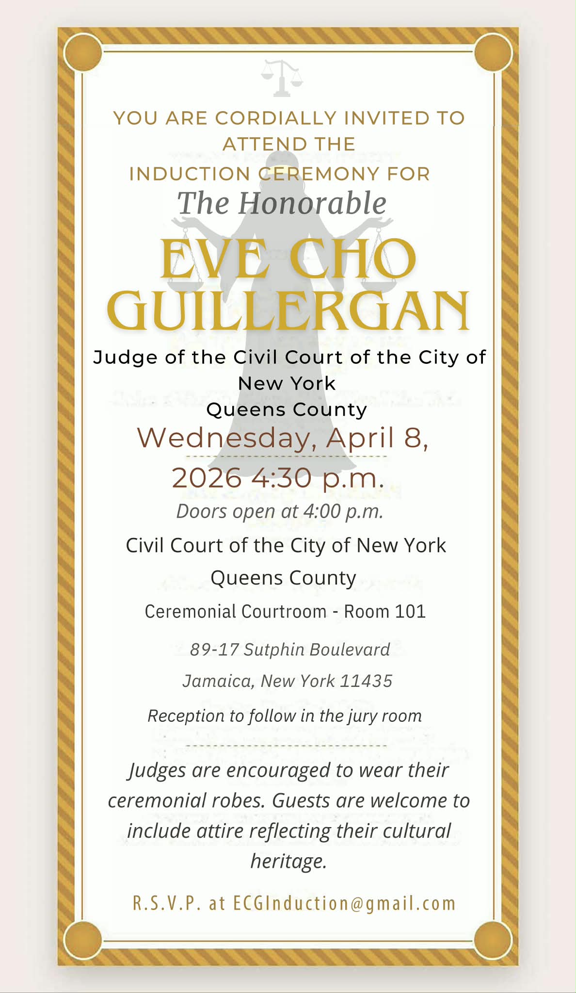 Induction ceremony for Eve Cho Guillergan, Judge of the Civil Court of the City of New York, Queens County